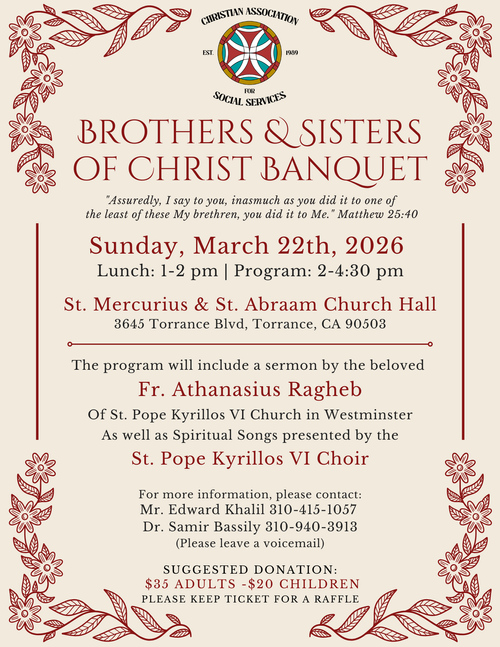 Annual Brother & Sisters of Christ Banquet Sunday, March 22, 2026 1:00 PM 4:30 PM Google Calendar ICS Join us for our annual Brother & Sisters of Christ Banquet in Torrance, CA. We will be blessed with Fr. Athanasius Ragheb as a speaker, and the choir of St. Pope Kyrillos VI Choir.